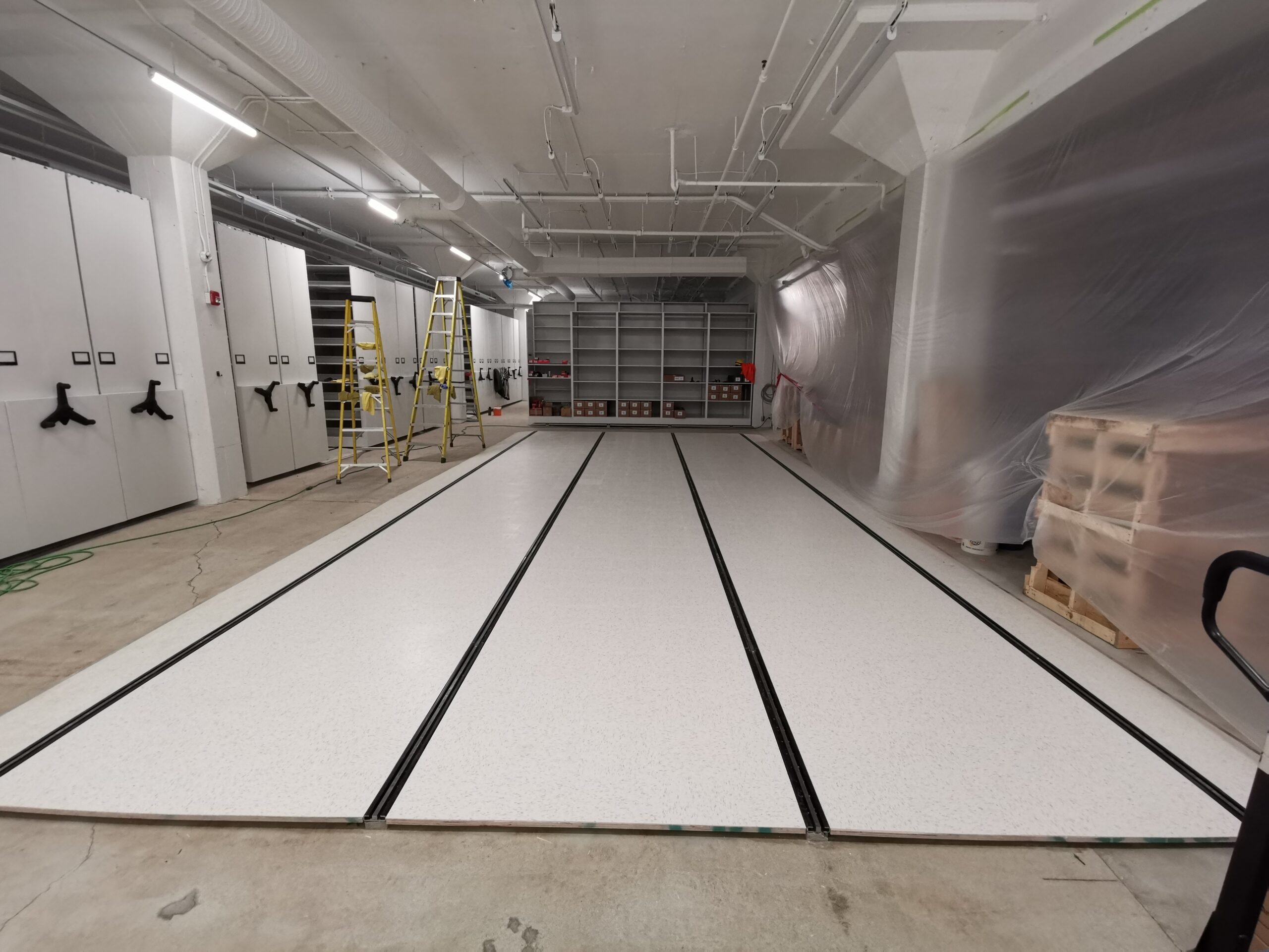 By September, everything we needed for the compact mobile shelving floor arrived and Hi-Cube Storage Systems crews began installing the first of three sections of raised floor and rails. During this, the new lights went up and the ceiling and walls were painted.